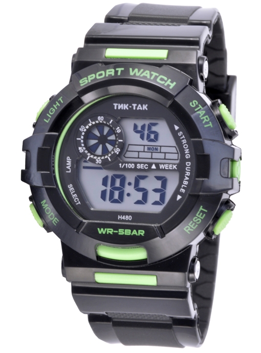 |  нажмите для увеличения | Электронные часы ТИК-ТАК Н480 WR50 черно-зеленые | Материал корпуса | Пластик | | Размеры корпуса | | | длина | 48 мм. | | ширина | 48 мм. | | толщина | 17 мм. | | Материал ремешка/браслета | PU | | Длина часов с ремешком | 220 мм. | | Механизм | Электронный с LCD дисплеем | | Особенности | 12/24 формат времени, дата, будильник, секундомер, подсветка. Водонепроницаемость 50м. | | Комплектация | Прозрачный пакет, паспорт, инструкция по эксплуатации и гарантийный талон |